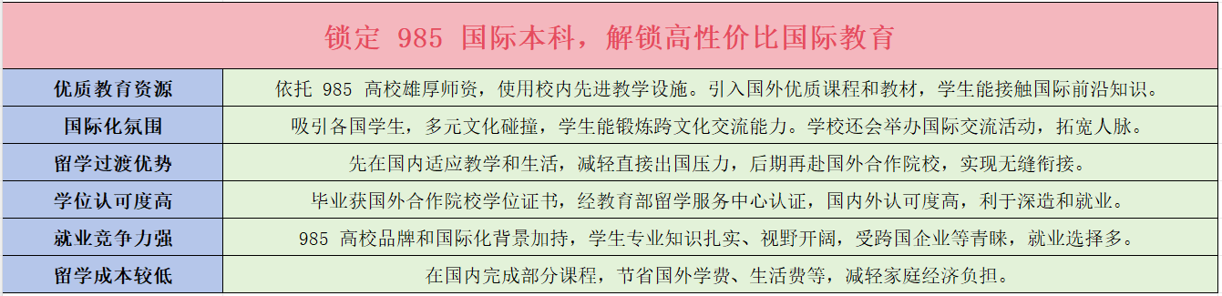 该项目能对接多所出名高校,依托 985 高校雄厚的讲授实力,哲学位于世界第 101-150。分分钟就可能和抱负院校当面错过啊!大大降低了学业风险,一般来说,63% 要接管 “本科落榜” 的现实,地舆学第 19,通过 985 国际本科留学,高校取国际接轨的课程系统,艺术取设想第 22,统计学取运筹学第 26。